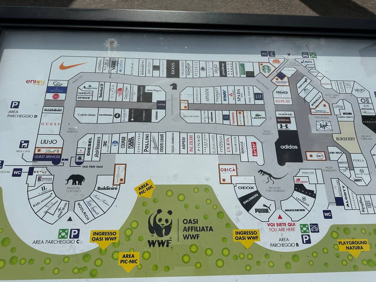 Аутлет Castel Romano в Риме. Самый популярный аутлет, где можно приобрести вещи самых известных брендов или массовых производителей. Обе части аутлета через дорогу друг от друга. И каждый на любой вкус и кошелек может удовлетворить свои запросы. Брендовые вещи можно приобрести со скидкой от 30 до 50% от первоначальной цены. В сезон скидок скидка может быть и 70%:) А вас что в этой теме интересует? Задавайте вопросы и отвечу, если смогу:)