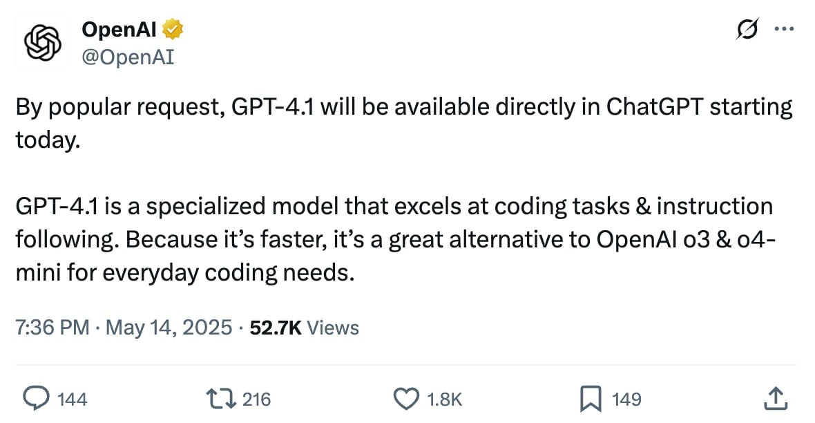 В ChatGPT была добавлена версия GPT-4.1, являющаяся одной из лучших нейросетей OpenAI для написания кода. Ранее она была доступна только в сторонних приложениях.