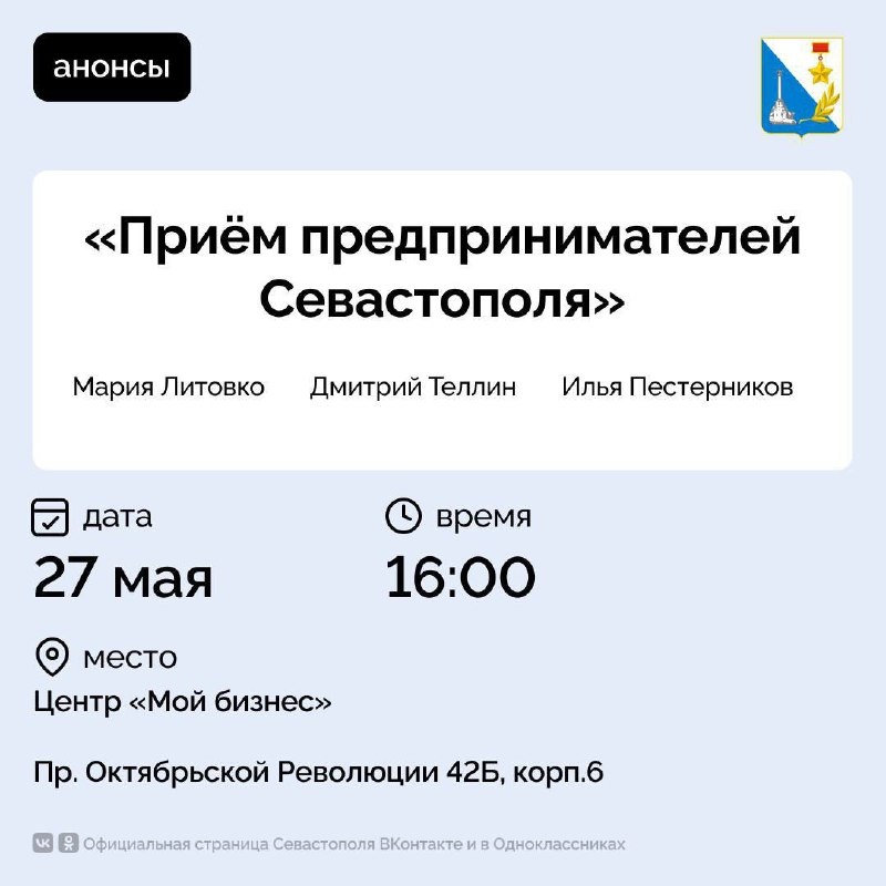 Приглашаем предпринимателей Севастополя! 📢 Задайте актуальные вопросы 27 мая на личном приёме вице-губернатору, первому заместителю прокурора города, бизнес-омбудсмену и руководителям профильных департаментов. Вы сможете обсудить актуальные вопросы: ▪️защита от необоснованных проверок ▪️решение бюрократических вопросов ▪️получение важных документов ▪️исполнение контрактов. Прием пройдет с 16:00 до 18:00 в Центре «Мой Бизнес» по адресу: проспект Октябрьской Революции, 42Б, корпус 6. Для участия обязательна предварительная запись по телефонам: +7 (8692) 53-02-14 +7 (978) 718-62-45 Воспользуйтесь шансом получить реальную помощь в решении деловых вопросов. Правительство Севастополя