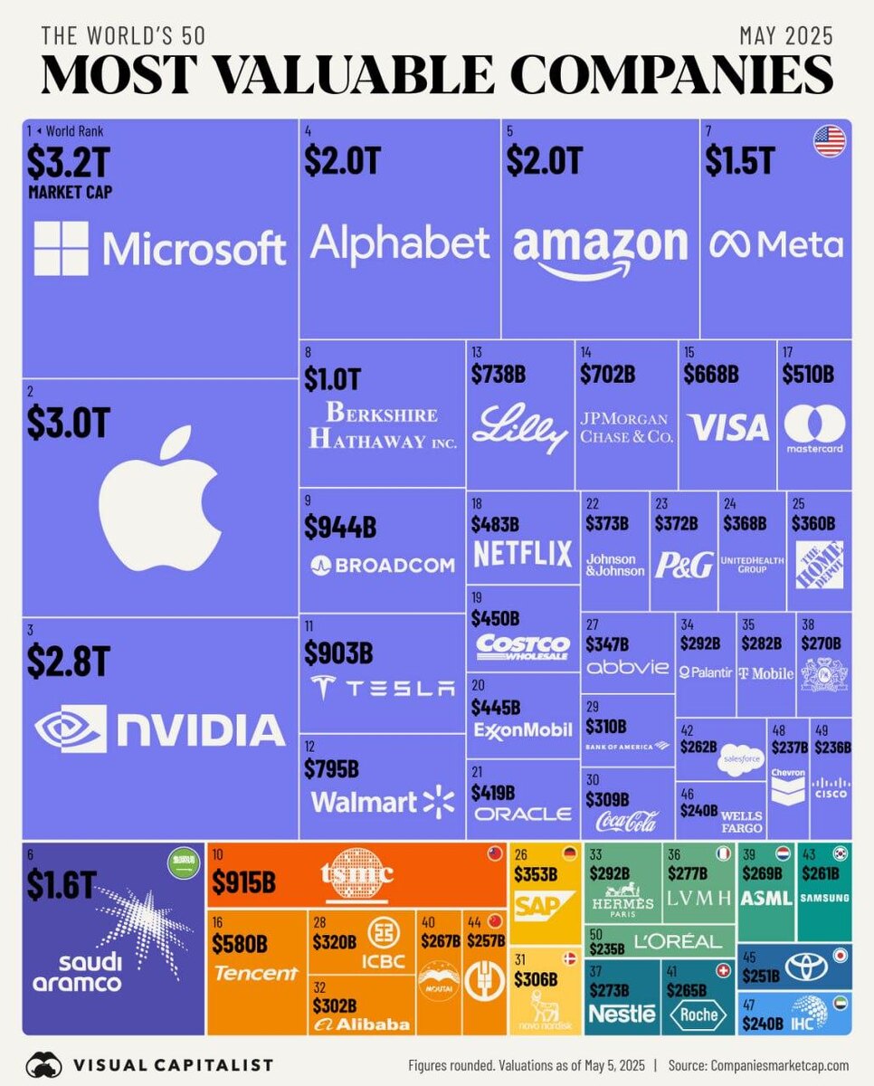 Топ-50 компаний мира по рыночной капитализации 🧳Свежие данные с мировых финансовых рынков! (по состоянию на 5 мая 2025 года) Microsoft и Apple продолжают играть в свои финансовые шахматы, периодически меняясь местами на вершине. Обе компании активно интегрируют ИИ в свои продукты, что подстегивает их капитализацию. За ними следует Nvidia, которая еще десять лет назад считалась просто производителем видеокарт для геймеров, а теперь это ключевой игрок в мире AI-технологий. Интересные неамериканские компании 🧳 🇦🇪 International Holding Company (IHC) Вот пример того, как можно трансформировать бизнес! Компания из Абу-Даби, которая изначально занималась рыболовством (!!!), превратилась в конгломерат с капитализацией 240 миллиардов долларов. IHC инвестирует во все: от здравоохранения и сельского хозяйства до недвижимости и ИИ. Включая инвестиции размером 50 миллионов в SpaceX Илона Маска. 🇹🇼 TSMC Taiwan Semiconductor Manufacturing Company — это, пожалуй, самая влиятельная компан