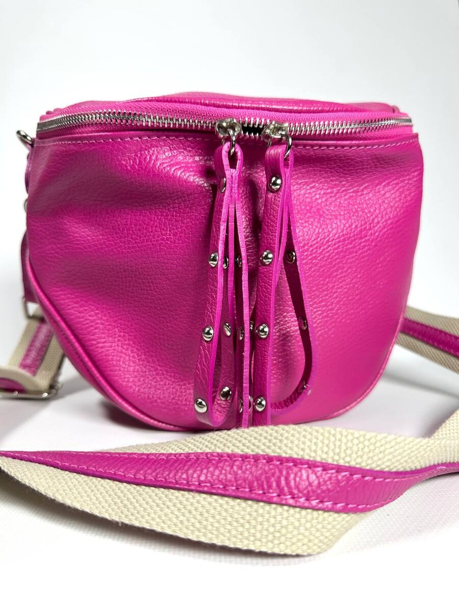 Небольшая вместительная и стильная кожаная сумка цвета фуксии с широким ремешком через плечо итальянского производства