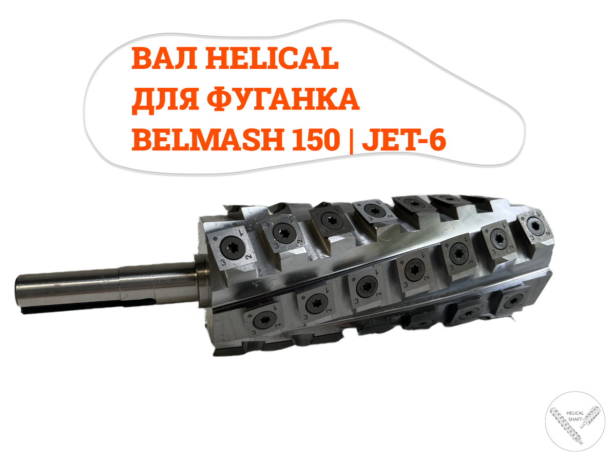 Вал Helical для фуганков Belmash 150 и Jet-6 ✔️6 рядов ножей по 7 штук в каждом ✔️Материал вала: сталь 45 ✔️Гарантия на заводской брак ✔️Изготовлен по размерам родного вала ✔️Ножи: 15х15х2.5 R150 30°