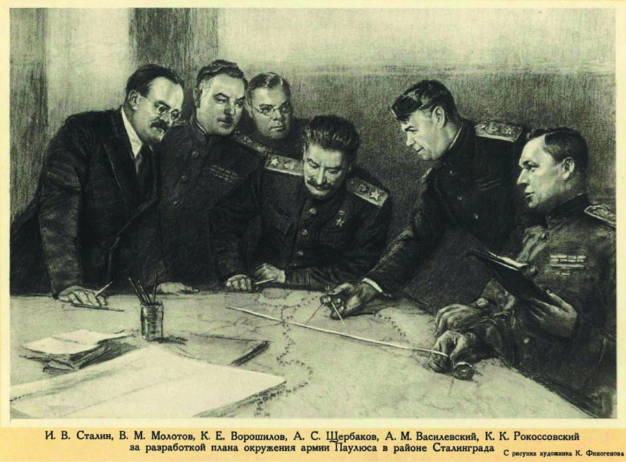 Кто является подлинным автором плана Уран? Неожиданный ответ кроется в малоизвестных картинах конца 1940-х годов. Перед нами рисунок известного сталинградского художника Финогенова под рабочим названием "Разработка плана Уран". За серию рисунков о Сталинградской Битве художник после войны получил Сталинскую премию. Таким образом, можно с уверенностью заявить, что Иосиф Виссарионович этот конкретный эскиз видел и его утвердил. Это важно для понимания того, что перед нами не просто рисунок, а по сути официальная версия исторического события - подготовки операции, где зафиксированы авторы плана. Думаю, внимательный читатель сразу увидит странность происходящего в этой комнате. Например, Рокоссовский изображён в маршальской форме, хотя это звание он получил только в 1944 году. А время разработки Урана, как вы помните, это октябрь, ноябрь 1942 года. Более того, хорошо известно, что Рокоссовский в это время неотлучно находился на Донском фронте и в Москву не выезжал. Самые внимательные чи