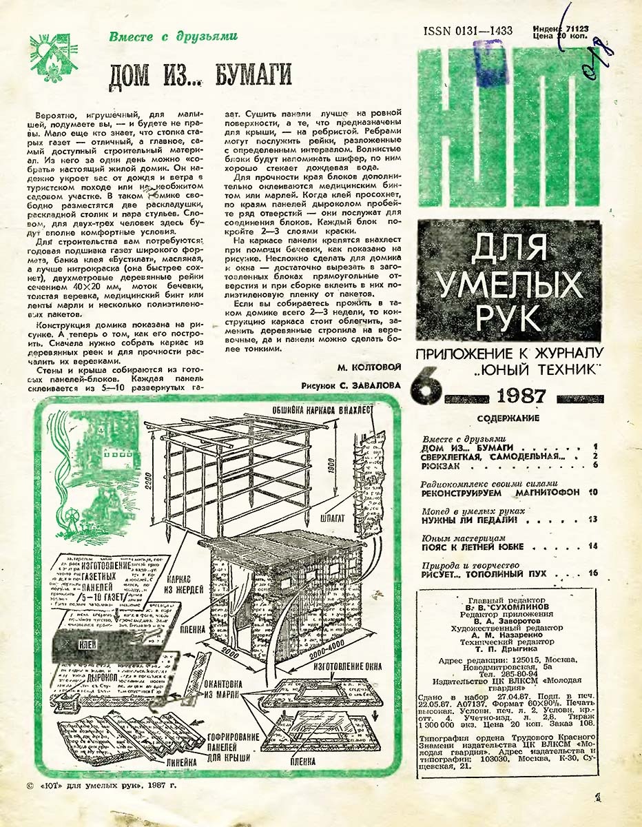 Воодушевленные текстом статьи из приложения к "Юному технику" мы решили тоже сделать газетный домик. Как там сказано "Мало еще кто знает, что стопка старых газет — отличный, а главное, самый доступный строительный материал. Из него за один день можно «собрать» настоящий жилой домик. Он надежно укроет вас от дождя и ветра в туристском походе или на необжитом садовом участке". Необжитый садовый участок, как раз и имелся в наличии, а со стройматериалами дело обстояло хуже. Зато, бесплатные газеты в то время были повсюду: В магазинах, библиотеках в почтовых ящиках, а то и просто в подъездах недобросовестные разносчики оставляли их пачками. "Кому надо, тот возьмет" Далее говорилось, что для строительства потребуются: годовая подшивка газет широкого формата, банка клея «Бустилат», масляная, а лучше нитрокраска (она быстрее сохнет), двухметровые деревянные рейки сечением 40X20 мм Но домик этот был рассчитан на проживание в нем в течении одного летнего сезона, а мы в этом домике жить,