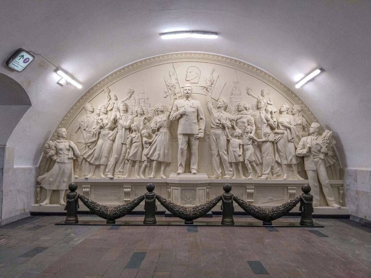 Барельеф со Сталиным открыли в переходе на «Таганской» Историческая справедливость торжествует! Это уменьшенная копия барельефа "Благодарность народа вождю-полководцу" с изображением Иосифа Сталина в окружении трудящихся и детей, который изначально располагался в торце станции «Таганская» до строительства пересадки (до 1965 года). По имеющейся информации, оригинальный барельеф после демонтажа был уничтожен.