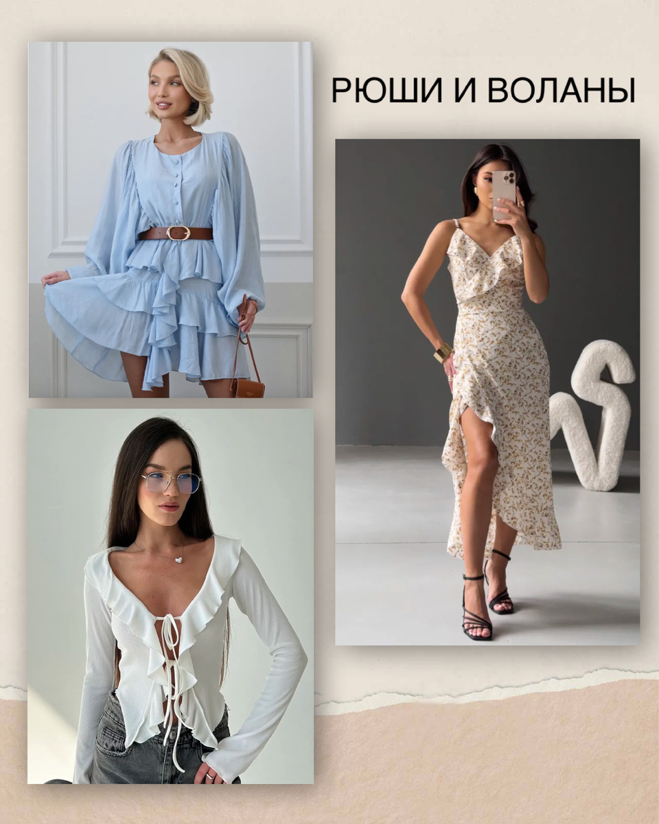 Лето — то время, когда так хочется выглядеть красиво, даже если за окном +30. И это возможно! Сегодня я собрала для вас ключевые тренды сезона (но не все), которые идеально подойдут и для прогулок, и для отпуска. Воздушные волны на платьях, юбках и блузках — фавориты сезона. Они добавляют образу лёгкости, особенно в сочетании с льняными тканями или шифоном. Чтобы не уйти в «сказочную фею», можно уравновесить образ кожаным ремнём, кожаными сандалиями или другими базовыми вещами. Идеальный вариант для тех, кто любит движение, ведь такие юбки очень удобны. Можно выбирать как мини, так и миди варианты. Наблюдение: чем проще верх, тем ярче играет сама юбка. Для вечера или более прохладной погоды. Складки и узелки на талии, груди или плечах — способ добавить обычному топу изюминку. Такие вещи легко сочетать с любыми базовыми вещами. И поверьте, скучно ваш наряд выглядеть не будет :) Кружевные корсеты, юбки, топы с рукавами-клёш и платья — да, это актуально. Но помните: кружево должно