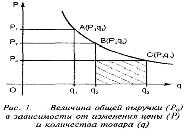 График показывает, что выручка при цене Р1 представляет собой площадь прямоугольника OP1Aq1 и характеризует эластичный спрос, т.е. при снижении цены совокупный доход возрастает. Прямоугольник OP2Bq2 соответствует нейтральной эластичности спроса в зависимости от изменения цены, валовая выручка (Р2q2) в данной области изменения цены не меняется. Прямоугольник ОРзCq3отображает условия неэластичного спроса. В этом случае снижение цены ведет к уменьшению совокупного дохода (выручки).
