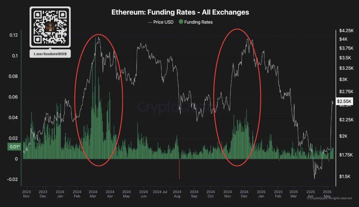 Уровень фандинга эфира пока что крайне низок, что открывает широкие возможности для его роста. На графике заметно, что в прошлом при увеличении фандинга рынок резко шёл вверх. Сейчас же мы видим устойчивый рост, но фандинг всё ещё остаётся низким. Это указывает на большой потенциал для дальнейшего укрепления актива. Когда фандинг начнёт расти, мы можем ожидать значительного ускорения роста. |HUB|