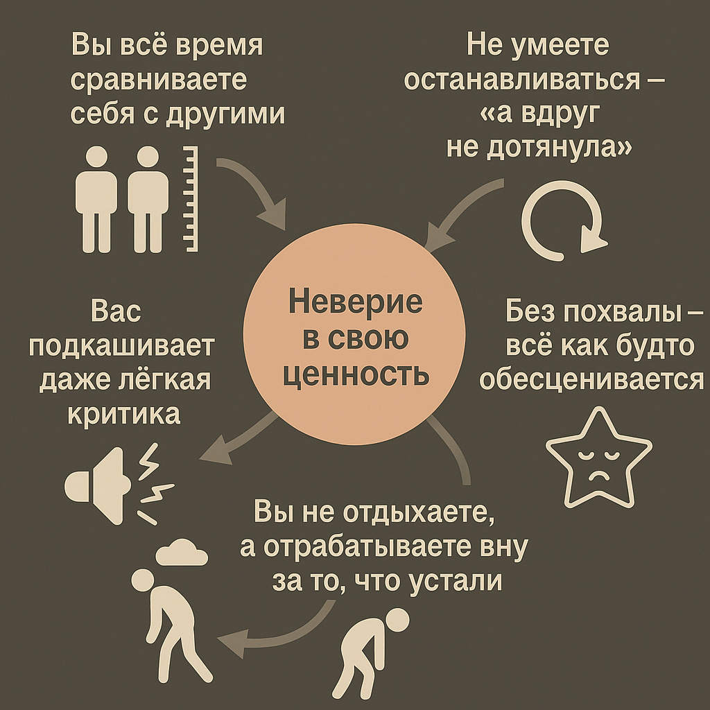 «Кажется, я всё делаю правильно — но внутри будто пусто». «Даже когда хвалят, я думаю: “Им просто повезло со мной”». «Я всё время стараюсь — но не чувствую себя хорошей». Если эти мысли вам знакомы — эта статья может многое изменить. Что такое внутренняя опора? Это не уверенность «на показ». Не «сильная позиция». И не «я знаю, что делаю всё правильно». Это ваше внутреннее “я в порядке”. Без условий. Без оценки. Без «если». Это та опора, которая остаётся, даже когда никто не хвалит. Когда не получается. Когда вы просто человек — а не результат. Почему её нет? Потому что с детства нас учили: – «Будь умницей — и тебя полюбят» – «Старайся — тогда заслужишь внимание» – «Сначала добейся — потом отдыхай» И тогда внутри вырастает голос, который всё время шепчет: «Ты пока недостаточно хороша» «Скоро все поймут, что ты просто везучая» «Если не стараешься — ты не заслуживаешь» Даже когда объективно всё неплохо — жить с этим голосом тяжело. История из практики Однажды ко мне пришла клиентка — умна