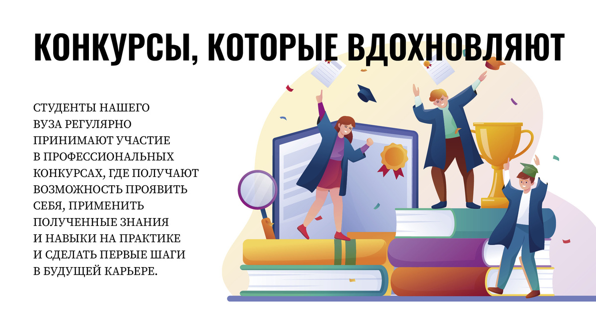 Студенты нашего вуза регулярно принимают участие в профессиональных конкурсах, где получают возможность проявить себя, применить полученные знания и навыки на практике и сделать первые шаги в будущей карьере.
