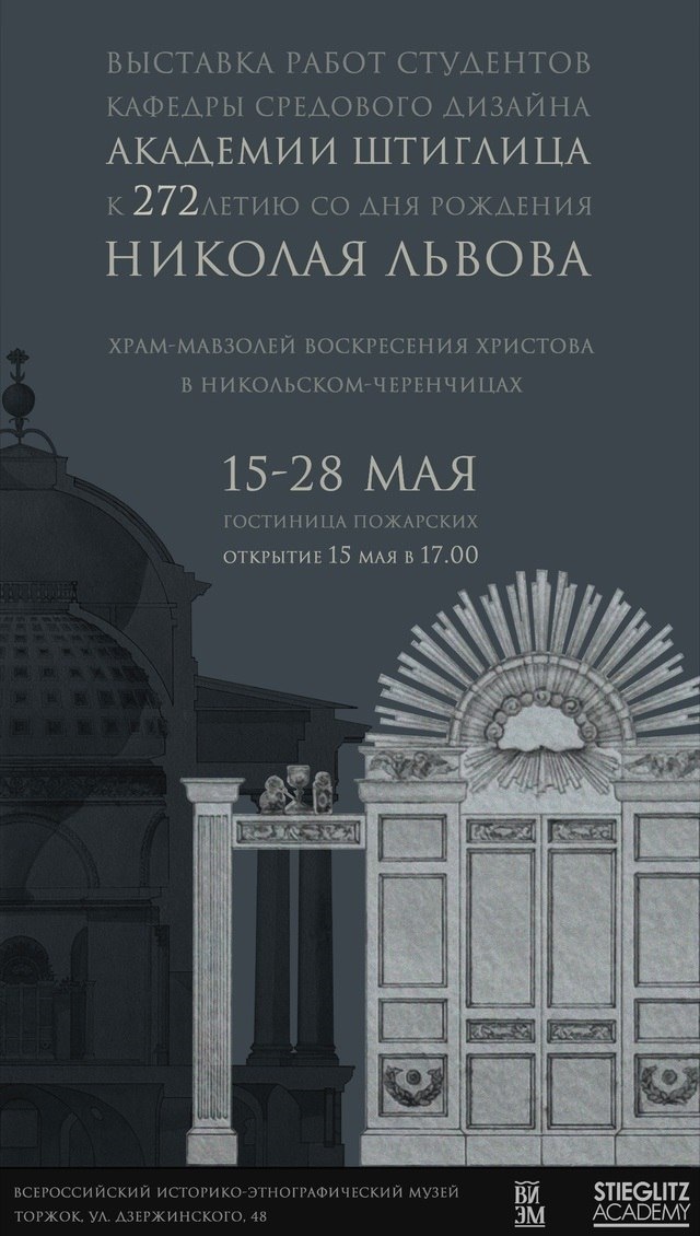 В Гостинице Пожарских 15 мая в 17.00 состоится открытие выставки студенческих работ Академии Штиглица на тему восстановления наследия архитектора Николая Львова. Руководитель проекта - доцент кафедры средового дизайна Академии Штиглица @stieglitzacademy (СПГХПА им. А.Л. Штиглица), профессор МААМ, руководитель архитектурного бюро ТЕКТОНИКА, председатель отдела по церковной архитектуре СА Санкт-Петербурга, член Союза архитекторов России Кирилл Яковлев. Вход свободный. #виэм #Торжок #АкадемияШтиглица #АфишаТоржок #ГостиницаПожарских