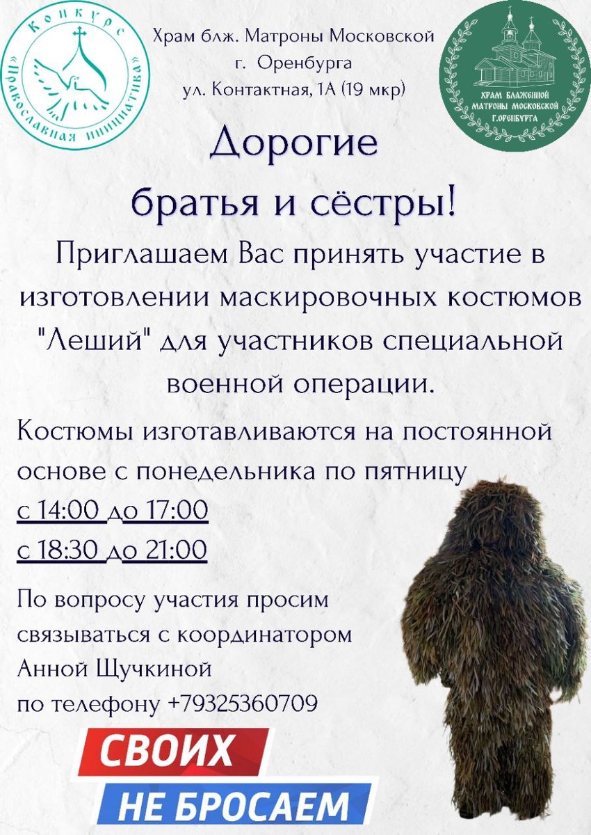 🕊️Дорогие друзья!🕊️ Храм блж. Матроны Московской г. Оренбурга ведет активную работу по оказанию помощи участникам СВО и их семьям. При поддержке Международного грантового конкурса "Православная инициатива" в рамках реализации проекта "СВОи люди" в храме ведется активная работа по плетению и сборке маскировочных костюмов "Леший" для ребят, которые сейчас на передовой защищают интересы нашего государства🇷🇺 Если у вас есть желание помочь бойцам и немного свободного времени, то каждый может оказать посильную помощь и внести свой собственный вклад в изготовление маскировочных костюмов "Леший". Не забывайте, что 80% Победы куётся в тылу! Координатор работы по изготовлению маскировочных костюмов Анна Щучкина, телефон для связи 89325360709☎️ 🚍Адрес храма: г. Оренбург, ул. Контактная, 1а (19 мкр, в районе Фермер базара)
