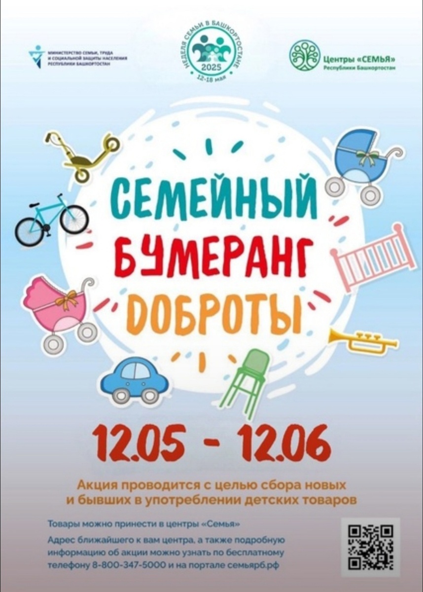 «Семейный бумеранг доброты» возвращается – чтобы снова объединить добрые сердца Башкортостана. 12 мая стартовала республиканская акция, ставшая символом поддержки и взаимопомощи в нашей республике. Центры «Семья» собирают детские вещи в хорошем состоянии – коляски, кроватки, стульчики, велосипеды, одежду и многое другое – для семей, оказавшихся в трудной жизненной ситуации. Особое внимание – семьям с двойнями и тройнями, семьям на социальном сопровождении, а также тем, кто столкнулся с серьёзными трудностями. Специалисты центра Аургазинского района отмечают, что прошлом году, благодаря участию 281 семьи и 16 организаций, было собрано более 2,5 тысяч предметов: от одежды и предметов первой необходимости до колясок, детской мебели и даже ноутбука. Всё это передано многодетным, неполным семьям, семьям с детьми с ОВЗ. Акция продлится до 12 июня 2025 года.