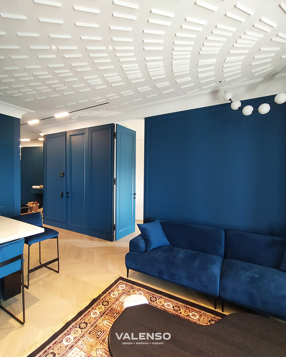 Возвращаемся в квартиру, расположенную в Москве в ЖК «Фили Град». Одним из акцентов этого интерьера, безусловно, стал цвет: насыщенный синий формирует образ и настроение всего пространства. Чтобы поддержать дизайнерскую задумку и сохранить единство восприятия, межкомнатные двери также были окрашены в этот цвет. Однако в соседних помещениях, например, в спальне, цветовая гамма более традиционная. Это потребовало нестандартного подхода — двери были покрашены в разные цвета с разных сторон. Со стороны гостиной — насыщенный синий, а со стороны спальни — белый. При этом мы тщательно продумали границу цветов на торце дверного полотна, чтобы дверь гармонично вписывалась в интерьер каждого помещения и смотрелась цельно с любой стороны. Автор проекта — Дарья Руссу.