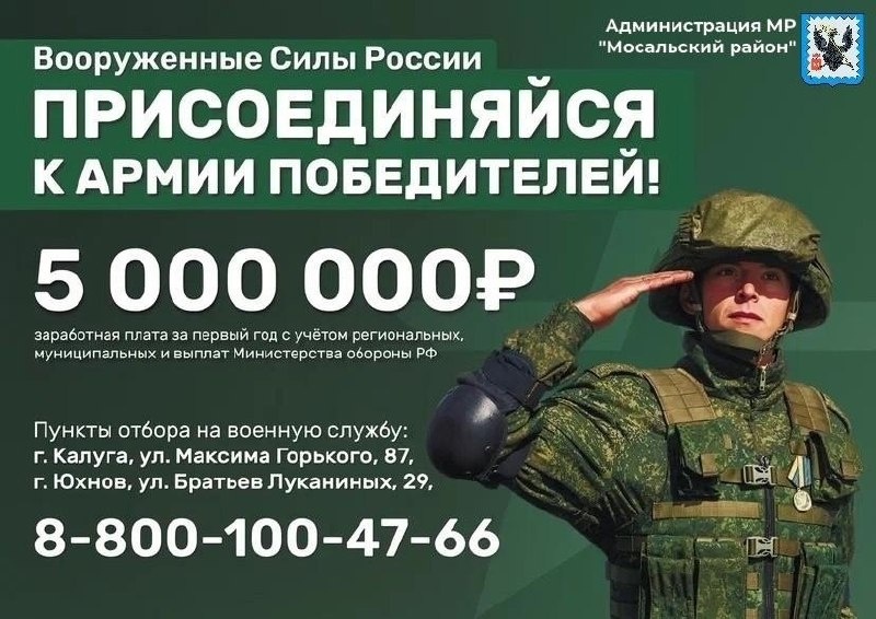 🇷🇺 Военная служба по контракту - это достойный выбор патриота России. Вклад в обеспечение безопасности и обороны государства можешь внести и ты! 📍За более подробной информацией можно обращаться в пункт отбора на военную службу по контракту в г. Калуге по адресу: г. Калуга, ул. М. Горького, д. 87; тел: 8-800-100-47-66. С должностями военной службы и условиями её прохождения можно ознакомиться по ссылке: clck.ru/3Cudqe #АдминистрацияМРМосальскийРайон