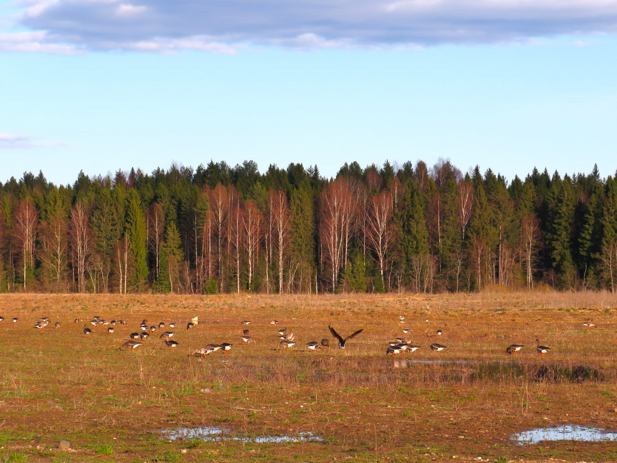 Дикие гуси выбрали нашу живописную местность для отдыха и кормления Природа здесь словно холст ,на котором она рисует свои шедевры .Наблюдать за грациозными птицами -это как смотреть на танец света и тени , где каждое движение наполнено магией .Разве не удивительно ,как природа создаёт такие волшебные моменты? Гуси - это странники ,которые принесли с собой дыхание весенних полей .Кто они , эти птицы , что напоминают нам о том , что мир не стоит на месте ? Они двигаются , как река , унося с собой заботы и тревоги . А разве не это и есть настоящая свобода - быть частью вечного потока жизни?