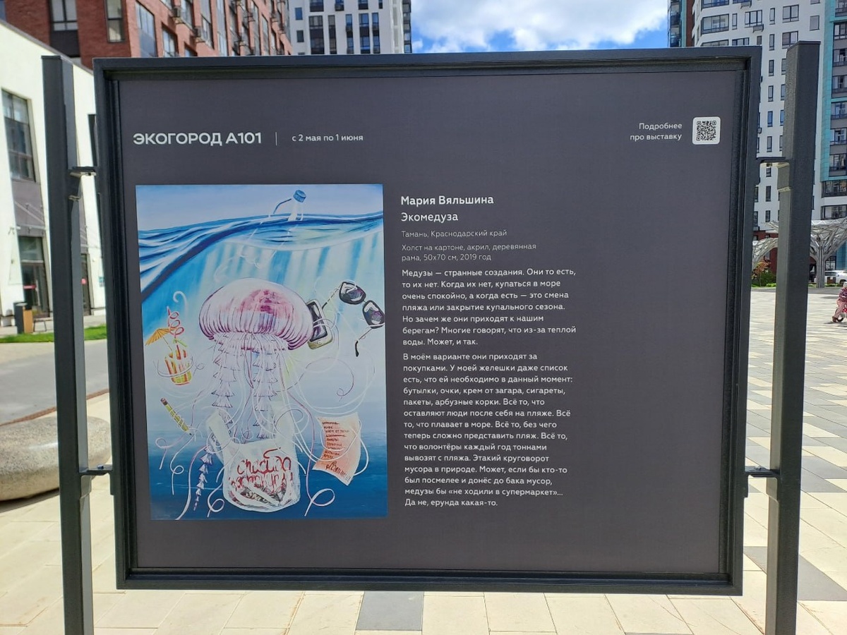 Моя «Экомедуза» участвует в выставке «Экогород А101» на площади Туве Янссон в квартале № 165 московского района Коммунарка. Это центральное общественное пространство жилого района «Скандинавия» - одно из основных точек притяжения района и соседних кварталов. Выставку проводит застройщик «А101» и сообщество Опен Коллс. Организаторы стремятся показать «экологию в действии», когда природа, человек и искусство образуют единую впечатляющую систему, и через визуальные образы донести идею гармоничных и ответственных взаимоотношений с окружающей средой, вдохновить москвичей и гостей столицы заботиться о природе: «Ведь только от человека зависит, каким будет его след на земле — новое дерево или брошенная пластиковая бутылка».