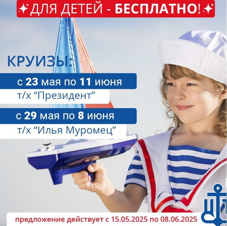 😁 🛳 🌈 К Дню защиты детей акция - круиз для детей бесплатно! Акция распространяется на следующие круизы: Теплоход «Президент» на круизы с 23.05.2025 по 11.06.2025 Теплоход «Илья Муромец» на круизы с 29.05.2025 по 08.06.2025 Условия бронирования для детей до 14 лет на т/х «Президент»: в каютах категории «2-местная» второе основное место для ребенка бесплатно в каютах категории «2-местная увел. площади с доп. местом» 2-й ребенок со скидкой 50% (доп.место – раскладное кресло) в каютах категории «3-местная» 2-й ребенок со скидкой 50% в каютах категории «Президентский Люкс», «Солнечный Люкс», «ПК» 2-й ребенок со скидкой 50% (доп.место – раскладное кресло) Условия бронирования для детей до 14 лет на т/х «Илья Муромец»: в каютах категории «2-местная» второе основное место для ребенка бесплатно в каютах категории «2-местная увел. площади» 2-й ребенок со скидкой 50% (доп.место – раскладное кресло или стандартная раскладушка, в зависимости от категории каюты) в каютах категории «Президе