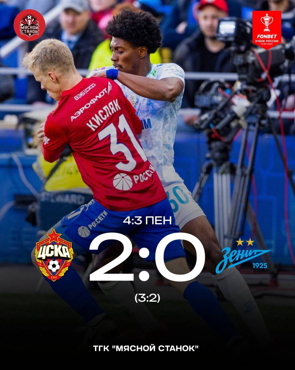 🐴🦁14 мая 2025 года в Москве состоялся ответный матч финала Пути РПЛ Кубка России между ЦСКА и «Зенитом». После поражения 0:2 в первой встрече, армейцам необходимо было отыграть два мяча, чтобы перевести противостояние в серию пенальти. И им это удалось: ЦСКА победил со счётом 2:0, а затем оказался сильнее в серии пенальти, обеспечив себе выход в Суперфинал турнира. ⏺Ход игры: ЦСКА впервые приблизился к голу после ошибки защитника «Зенита» Алипа, и мяч оказался у Мойзеса, но тот не сумел воспользоваться шансом и пробил мимо. Уже тогда стало ясно: матч потребует чего-то неожиданного от хозяев. Армейцы это поняли и нашли нестандартное решение, которое перевернуло игру. Адамов неудачно выбил мяч от своих ворот — его тут же подхватил Мойзес, который выдал отличный пас на Кисляка. Тот сместился вперёд, сыграл в стенку с Койта и из-за пределов штрафной изящно перекинул мяч через голкипера. ЦСКА вышел вперёд — 1:0. А вот на 47-й минуте подвёл команду Обляков, не сумев реализовать пена