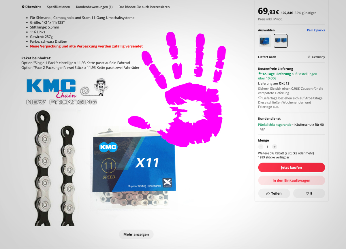 За оригинальными цепями KMC теперь, только к нам! Мы снова и снова получаем жалобы на продукты, которые на первый взгляд выглядят как KMC, но после проверки оказываются подделками низкого качества. Мы знаем об этой проблеме, но для нас практически невозможно выявить все эти источники и принять меры против производителей подделок. Чтобы повысить эффективность наших мер, мы сотрудничаем с Sentryc, авторитетной компанией по защите брендов, использующей технологию искусственного интеллекта, для активного мониторинга мировых рынков с целью быстрого и эффективного выявления и пресечения деятельности продавцов поддельной продукции KMC. Благодаря очень высокому показателю успешности и оперативности процесса, Sentryc поможет KMC прекратить эти вредоносные атаки как на наш бренд, так и, в конечном счете, на качество ваших поездок на велосипеде. С