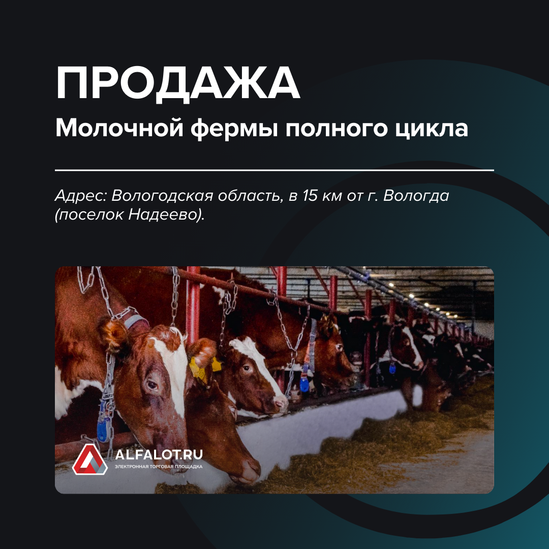 ❗️ Успейте приобрести: остается все меньше времени, чтобы подать заявку на участие❗️ 🌐 Продается имущественный комплекс молочной фермы в Вологодской области Процедура №0026025015DS | Аукцион на повышение | Стартовая цена: 730 000 000 ₽ К продаже предлагается молочная ферма полного цикла, включающая 333 объекта движимого и недвижимого имущества, земельные участки, технику и поголовье КРС. 📍 Локация: Вологодская область, поселок Надеево (15 км от Вологды) 🐄 Поголовье: 1385 голов, из них 694 — дойные коровы (айрширская порода) 🏠Техника и спецоборудование: более 40 единиц 🏠 Здания: 3 коровника, телятники, доильный зал, убойный цех, гараж, офисы, жильё для персонала (1500 м²), овощехранилище 🍘Земля: 1267 Га сельхозназначения ✔️ Газ, свет, скважина питьевой воды 💵Начальная цена: 730 000 000 ₽ 🔔 Форма: аукцион на повышение, шаг — 1% ⚖️ ПЕРЕЙТИ К ТОРГАМ 📅 Дата начала приема заявок на участие в торговой процедуре: 00:00 по Московскому времени «26» апреля 2025. 📅 Дата начала проведен