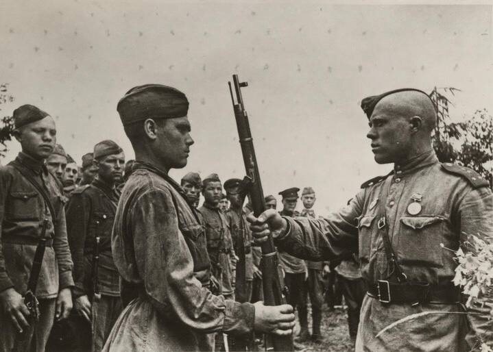 📎 Виктор Тёмин. Командир Красной армии вручает винтовку бойцу перед боем. 1943.