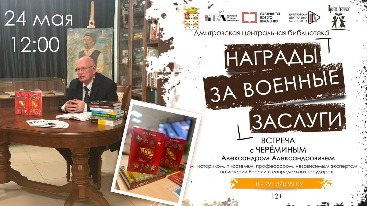 Приглашаем на встречу с Александром Череминым в рамках фестиваля семейного чтения «ПредпоЧтения»! 📚 Александр Александрович Черемин - историк, писатель, профессор, независимый эксперт по истории России и сопредельных государств. Автор множества публикаций на темы геополитики, антитеррора, фалеристики, военной истории, краеведения, биографии выдающихся деятелей, генеалогии и истории исчезнувших государств. 📌Награды СССР за военные заслуги в основном были учреждены в годы Великой Отечественной войны. Это были награды полководческие и флотоводческие, а также за взятие городов и регионов. Большая часть населения страны и воинские части были награждены именно по результатам боёв и личного героизма. 📆24 мая в 12:00 📌г. Дмитров, ул. Почтовая, д.16, корп.2 ☎8(496)22-7-49-92, 8-991-340-99-09 (ресепшн) ✅Бесплатно! #туризмдмитров #молодежьдмитров #культурадмитров #дмитров #библиотекановогопоколения #ДмитровскаяБиблиотека