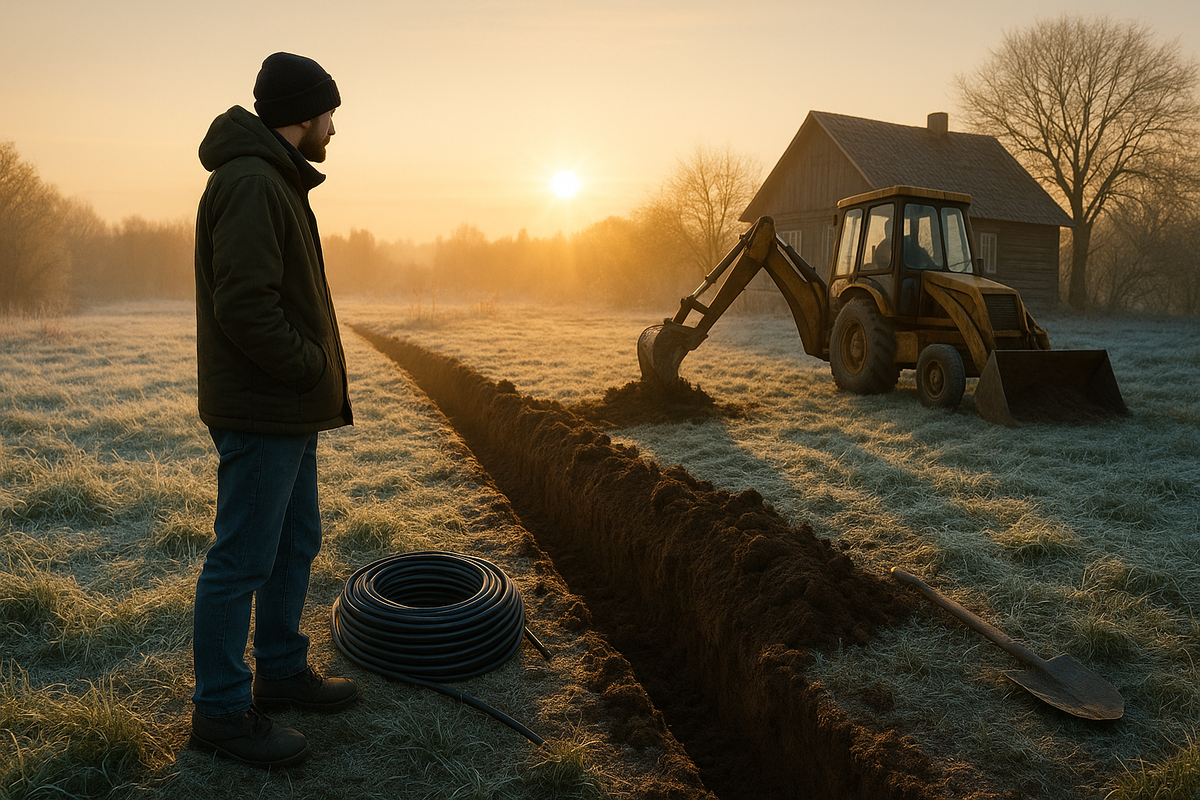 Раннее утро на хуторе встречает меня ледяной прохладой. Солнце еще только поднимается над горизонтом, но мороз уже успел укрыть траву серебристым инеем. Там, в низине, виден настоящий белый ковер — мороз отбелил все травинки. И хоть утро обещает тепло, земля пока еще холодна. Сегодня день большой работы. Приезжает техника — будем копать траншеи, прокладывать кабель, проводить воду. Задача не из легких, но и без этого никак. Я стою на улице, вглядываюсь вдаль, где уже проглядывают первые лучи солнца, и думаю о том, как все быстро меняется. Еще недавно мечтал о свете в доме, а теперь уже начинается прокладка кабеля. Подъезжает машина, и из нее выгружают бухту кабеля. Черный, тяжелый, свернутый в тугую спираль. Сразу понимаю — работать будет непросто. Земля еще твердая, и копать вручную — настоящее испытание. Но выбора нет. Вижу, как ребята начинают разматывать кабель, а я беру лопату и начинаю копать. Ледяная земля скрипит под лезвием, но вскоре уступает. Проходит час, потом второй. Мы п