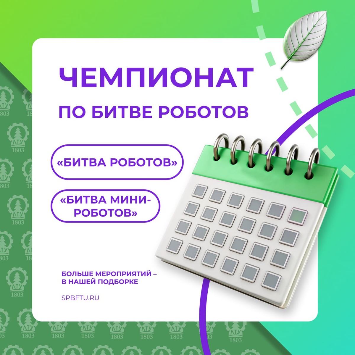 Дорогие студенты ⚡️ Приглашаем вас принять участие в Международном чемпионате по битве роботов! 🤖 Это зрелищное событие и международная платформа для обмена опытом в области робототехники. Изобретатели и лучшие технологии со всего мира соберутся, чтобы продемонстрировать своё мастерство. ✅ В 2025 году чемпионат пройдет по двум дисциплинам: «Битва роботов» для всех возрастов с роботами весом до 110 килограммов и «Битва мини-роботов» для участников от 10 до 17 лет с роботами весом до 1,5 килограммов. Подробнее о мероприятии можно узнать по ссылке ⬅️