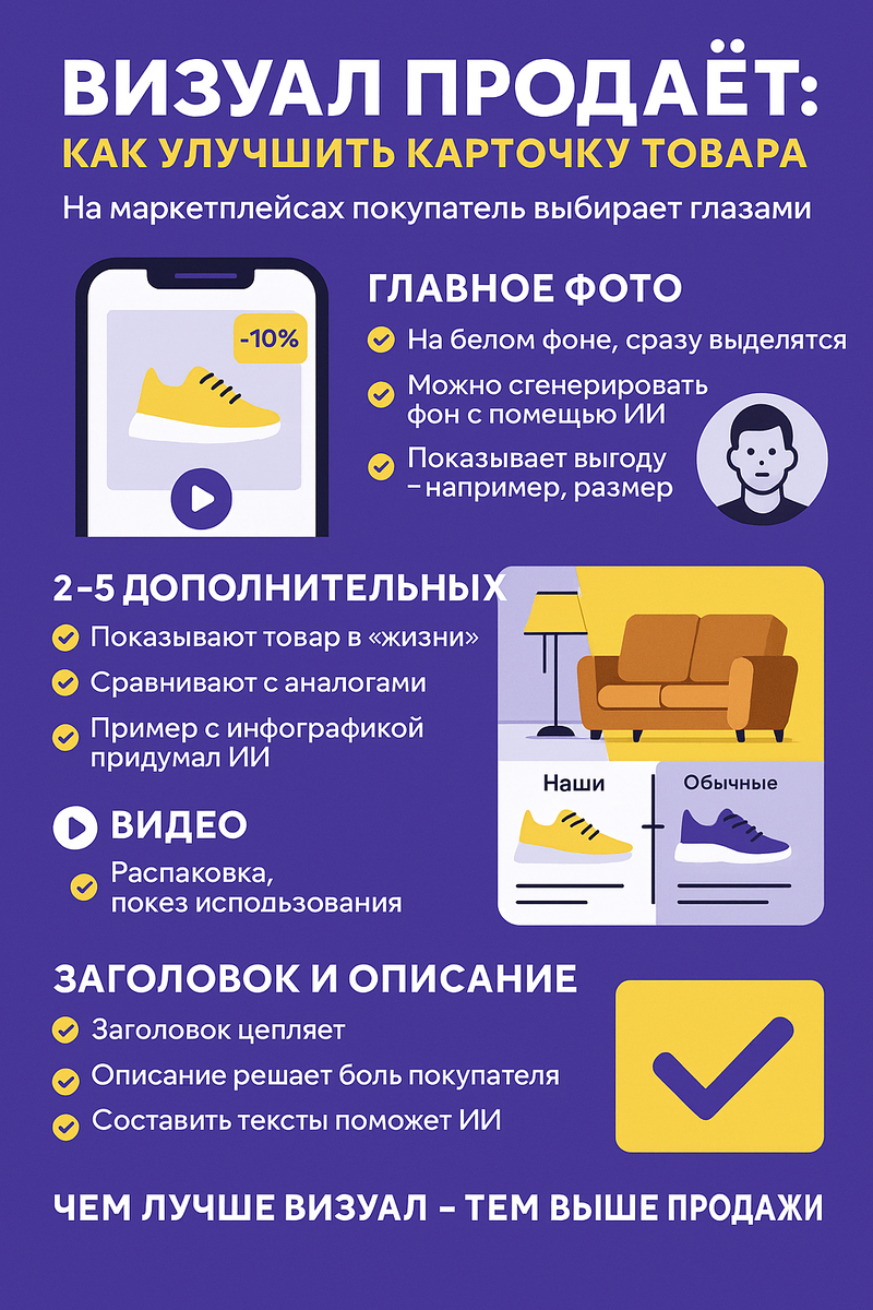 На маркетплейсах покупатель не может потрогать товар. Он «щупает глазами». И если ты не работаешь с карточкой — ты теряешь деньги прямо сейчас. 🔥 Что решает всё? 📍 Главное фото: – Белый фон, чистота, контраст – УТП на картинке — сравнение, масштаб, отличие – Идеально — если фотка сразу выделяется в ленте 💡 Подсказка от ChatGPT: загрузи фото конкурентов и попроси нейросеть найти закономерности: «что общее», «что цепляет». 📸 Сгенерируй фон в Midjourney или попроси идею для композиции. 📍 2–5 фото: – Покажи товар в жизни (в интерьере, в руках, в действии) – Добавь инфографику: схема размеров, инструкция, преимущества – Сделай сравнение: «наш товар» vs «обычный» 💡 ChatGPT+Canva → гайды, тексты, идеи и даже макеты можно делать за вечер. 🎥 Видео = +10–30% к конверсии Покажи: – Распаковку – Использование – Сравнение Сценарий? Попроси ChatGPT: «Сделай сценарий на 45 секунд для видео чайника — показать стиль, удобство, безопасность». 🧠 Тексты тоже влияют. Сильно. – Заголовок = ключи + см