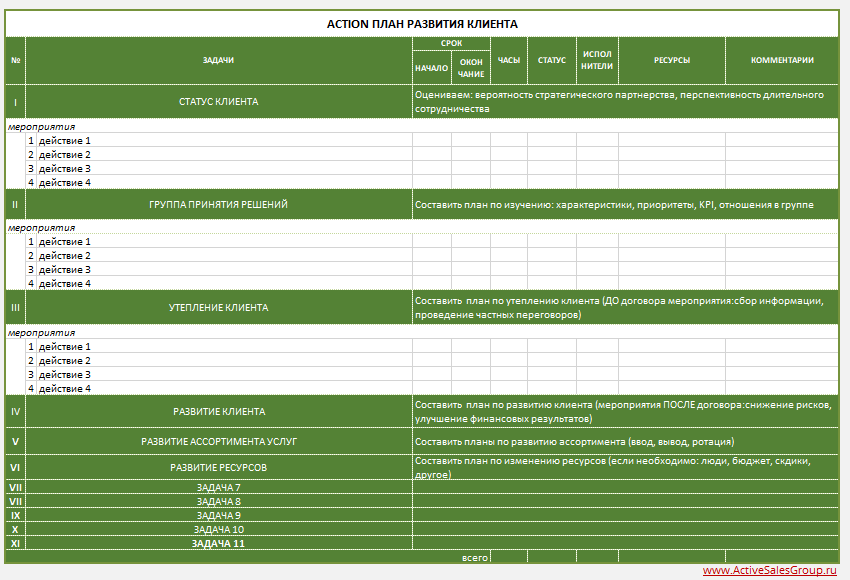 План действий (action plan) является неотъемлемым элементом эффективного управления, обеспечивая структурированность, своевременное выполнение задач и устойчивый рост отдела продаж. Он бывает двух видов: по стратегическому развитию отдела и по развитию клиентов. Каждый план действий должен включать в себя конкретные шаги: какие действия необходимо выполнить, кто будет ответственен за их реализацию, когда и в какие сроки их нужно завершить, а также какие ресурсы (персонал, финансы, материалы) потребуются. Не менее важно определить, какая информация и между кем должна циркулировать для эффективного выполнения плана. Это способствует прозрачности и координации усилий всех участников. Для того чтобы план действий был эффективным, он должен быть исчерпывающим, то есть включать все необходимые меры для достижения цели. Также план должен быть изложен понятно и доступно для всех менеджеров, чтобы избежать недоразумений и обеспечить его четкую реализацию. Важно также, чтобы он был релевантным т