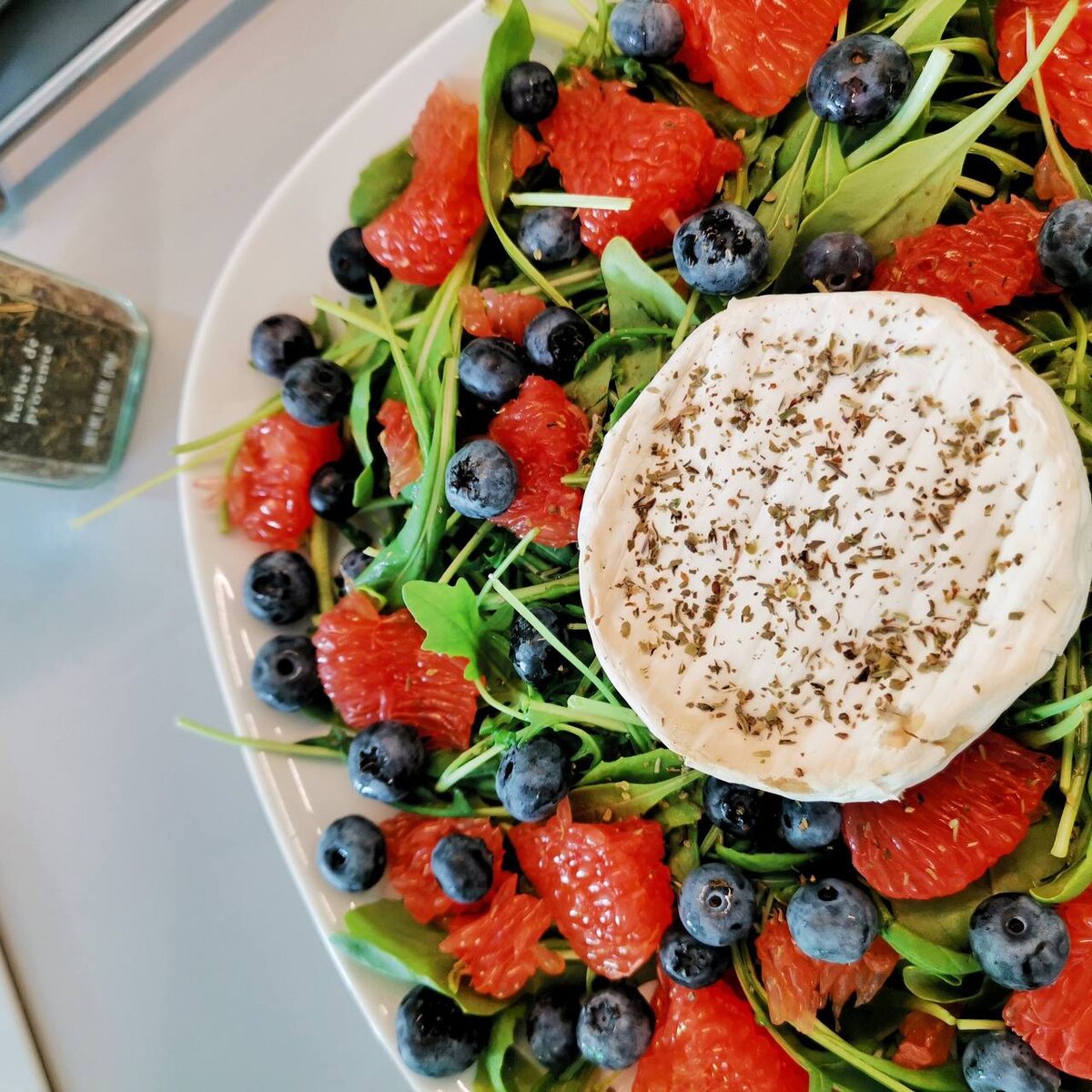 Летний салат с запечённым камамбером😍 Ингредиенты: Сыр камамбер 125 г Грейпфрут 1 штука Руккола 100 г Черника 100 г Прованские травы щепотка Оливковое масло extra virgin 1 чайная ложка Приготовление: 🥬Рукколу промыть в холодной воде. Камамбер отправить в духовку на 10 мин при t 200' ( для этого вытащить его из упаковки и положить в жаропрочную форму на фольгу или пергамент) Грейпфрут очистить от кожуры. Поломать каждую дольку на кусочки около 2 см, удаляя пленку. Выложить в блюдо вместе с зеленью. Камамберу дать остыть буквально минуту. Затем аккуратно переложить его в салат. Приправить сыр прованскими травами и оливковым маслом. Сделать ножом неглубокие надрезы. Добавить чернику🫐 и можно подавать 😍