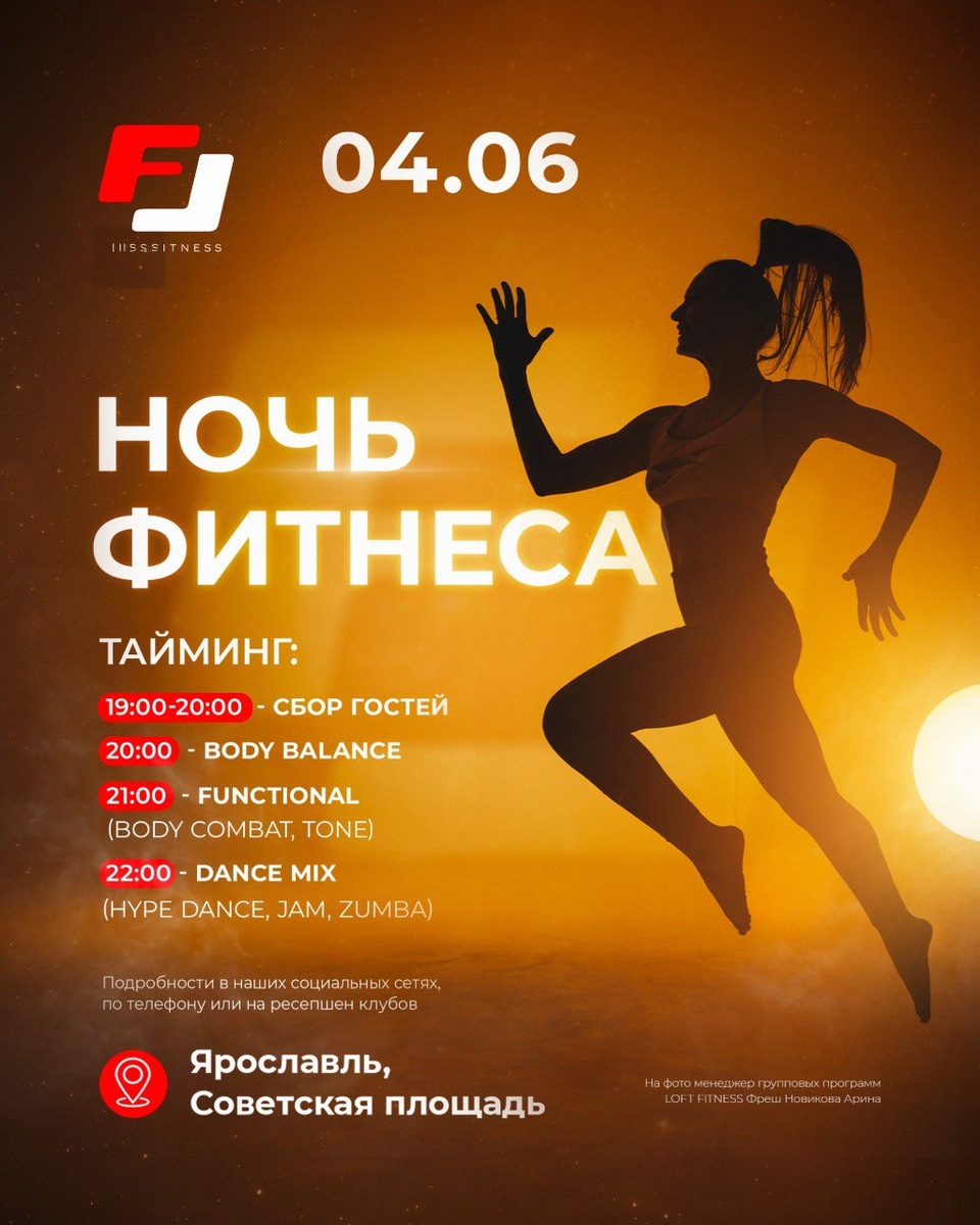 ⚡ НОЧЬ ФИТНЕСА: ЗАРЯДИСЬ ЛЕТОМ ⚡ Приходи 4 июня на самое грандиозное и зажигательное событие этого лета — Ночь фитнеса на Советской площади. Тебя ждут крутые тренировки от команды лучших тренеров Ярославля: BODY COMBAT, TONE, HYPE DANCE, JAM, ZUMBA. 🤩 Крупные партнеры; 🎤 Профессиональный ведущий; 🎁 Розыгрыш призов от Loft Fitness, в том числе клубных карт; ♥ Розыгрыш призов от партнеров; 🎸 Выступление группы LONGLONG и танцевальная тренировка под живую музыку. Но и это еще не все! ПЕРВЫЕ 200 УЧАСТНИКОВ ПОЛУЧАТ СТАРТОВЫЕ ПАКЕТЫ ОТ ПАРТНЕРОВ 🎁🤩 Регистрация уже открыта! Ночь фитнеса. 4 июня. Советская площадь. Не упусти свой шанс! ♥ #новостиклуба 🌐 LOFT FITNESS | ЯРОСЛАВЛЬ подписаться