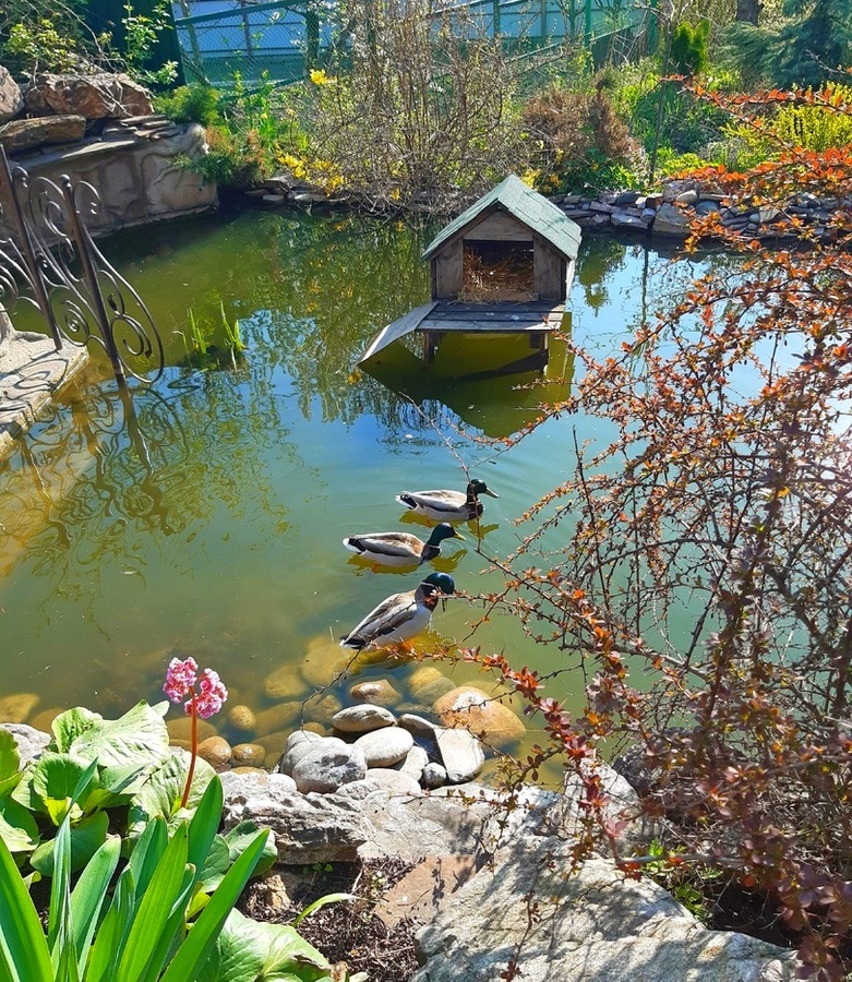 Во дворе жителей Курска уже семь лет подряд селится пара диких уток. С ранней весны до поздней осени они плавают в небольшом пруду с карпами, важно расхаживают по участку, а по утрам громко крякают, требуя завтрак. Историю необычного соседства куряне рассказали изданию «Друг для друга». На зиму птицы улетают, когда водоем замерзает, но куряне подозревают, что пернатые зимуют неподалеку — на реке Тускарь. А с первыми признаками весны возвращаются, часто еще до того, как растает лед, чтобы занять свой домик в центре пруда. Этот домик Ирина Подчилимова и ее муж построили специально для уток, когда поняли, что те стали постоянными гостями. Птиц назвали Ульяной и Яном. Уютное жилище привлекает и других уток, и весной на крошечном пруду даже случаются драки за территорию. Но Ян всегда отстаивает свой дом. «Мы узнаем «своих» по окрасу и поведению. Они уже совсем ручные, в отличие от других диких уток», — рассказывает Ирина. Однажды на утенка попыталась напасть кошка, но Ульяна храбро встала н