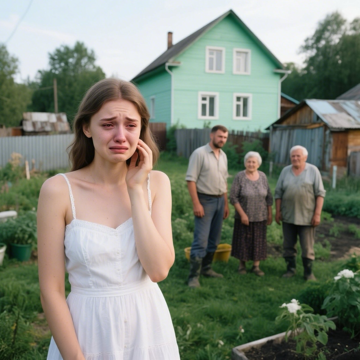 Следующие два часа превратились для Веры в настоящий кошмар. В своём лёгком летнем платье и сандалиях она пыталась выпалывать сорняки, постоянно царапаясь о колючки и отмахиваясь от комаров. Солнце нещадно жгло непокрытую голову. Когда она, наконец, закончила с грядкой, руки были в земле, ногти сломаны, а белое платье покрылось грязными пятнами.