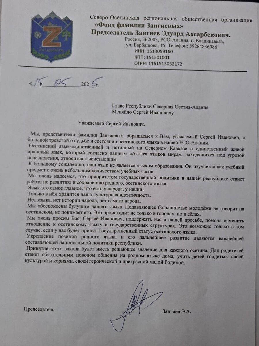 Фамилия Зангиевых обратилась к Сергею Меняйло с просьбой о принятии закона о государственных языках.