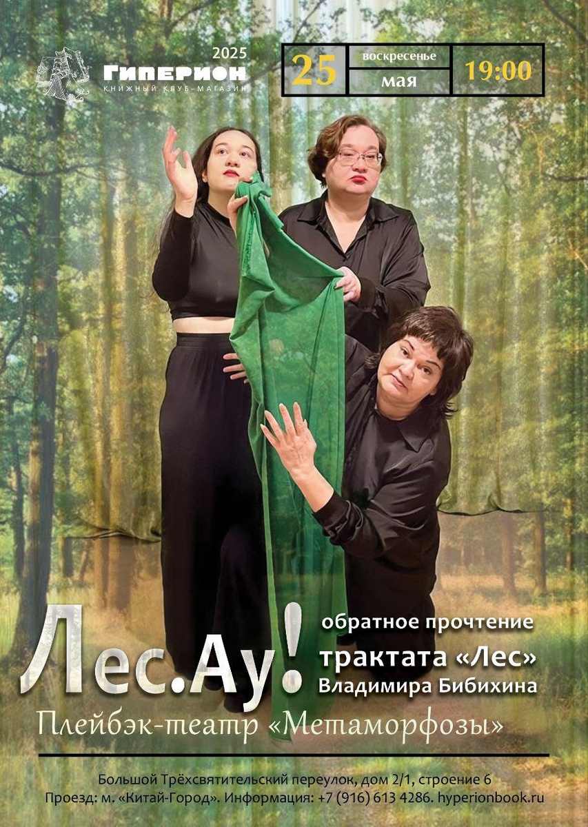 25.05.2025 воскресенье. #Москва Плейбэк-театр «Метаморфозы» (Санкт-Петербург) в перформансе «Лес.Ау!» Начало в 18:00 "Лес.Ау!" — живой эксперимент на стыке философии, импровизации и ваших личных историй. ### Почему это необычно? - Это часть масштабного проекта, затеянного Борисом Павловичем, "Лес.Бибихин", аналогов которому нет в мире: спектакль-грибница, растущий в разных точках страны. - Здесь нет сценария — только ваши воспоминания о лесе, обсуждение философских цитат и неожиданные театральные превращения. - Актрисы будут на лету воплощать ваши истории через метафоры и образы. ### Как это устроено? Три формата в одном: 1. Лесные байки — расскажите о своих приключениях среди деревьев. 2. Философский дуб — вытяните цитату из трактата Бибихина и поделитесь ассоциациями. 3. Тайные тропы — если вы встречали другие части "Леса", вас ждёт особый диалог. ### Для кого? - Для тех, кто любит театр, где стирается грань между зрителем и актёром. - Для философов-мечтателей и собирателей лес
