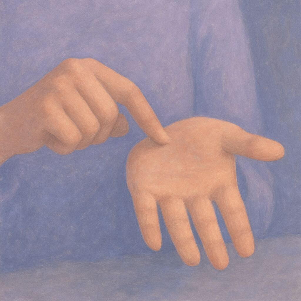 Представьте, что в центре вашей ладони находится кнопка отключения стресса. Нажмите на «кнопку» 10 раз указательным пальцем другой руки — словно вы передаёте мозгу сигнал успокоиться. На каждое нажатие делайте глубокий вдох. Повторите упражнение 2–3 раза.