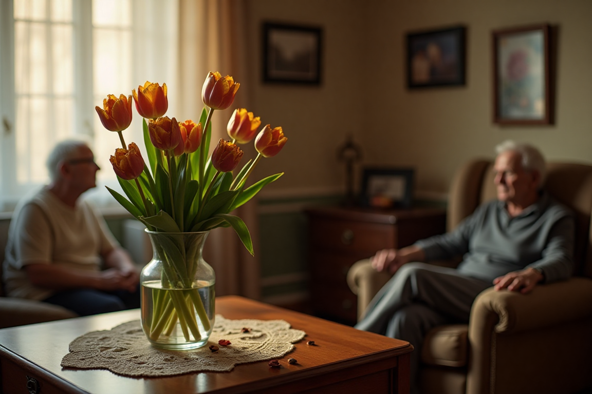 В тот первый вечер я взглянула на цветы и вдруг уловила — что-то треснуло в воздухе. Не потому, что тюльпаны были не первой свежести, а потому что за их хрупкой красотой пряталась наша затянувшаяся молчаливая грусть.