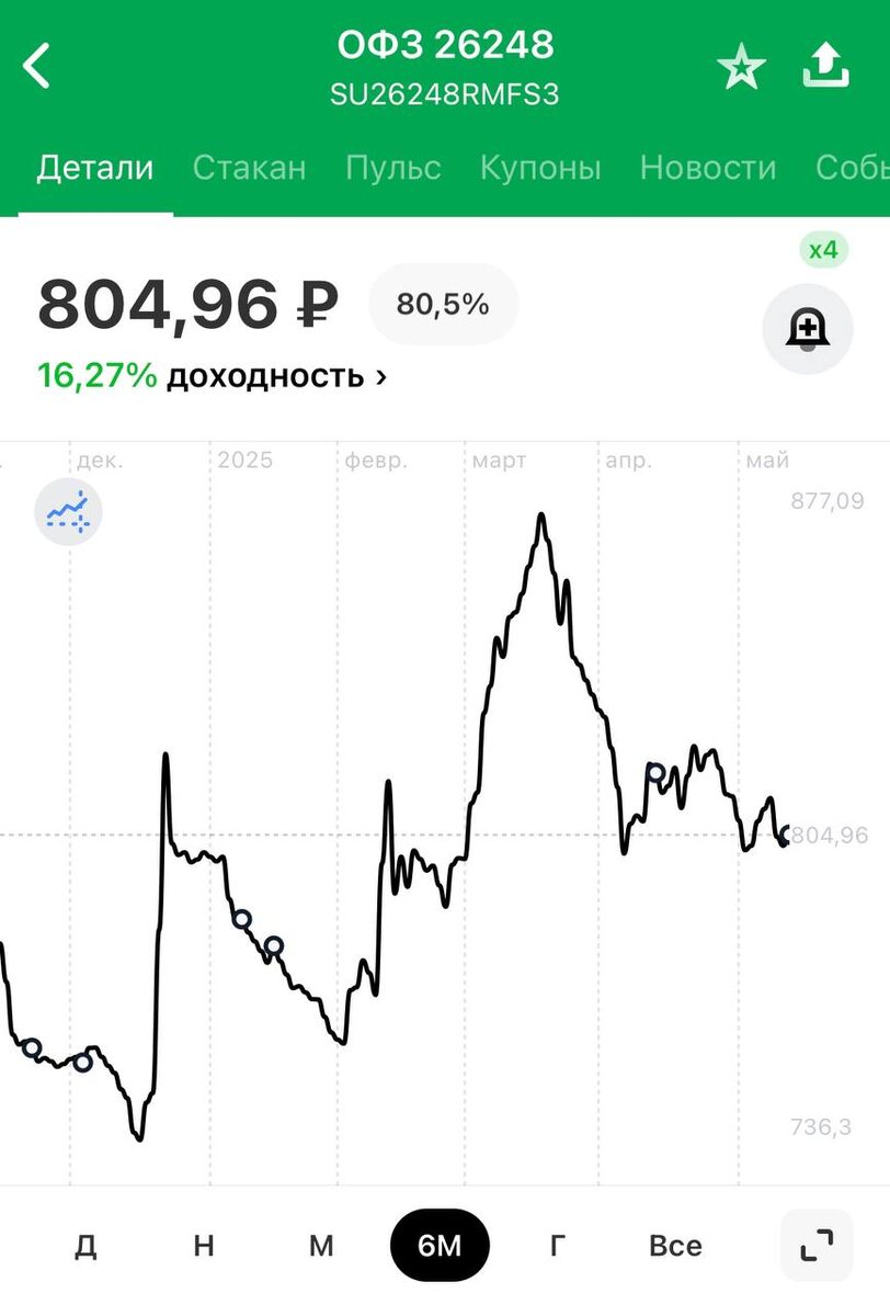 Ох уж эта геополитика В декабре и феврале были взлёты $IMOEXF по 400 пунктов, а потом падение на 500, рост на 400 и опять падение на 300 И каждый такой скачок всего 1-2 недели А общий рост с декабря до февраля под 1000 пунктов 😦 #кэш скопился на #иис более 10% $TGLD торгуется около моей средней, поэтому покупки его делаю минимальные, хотя последние несколько дней падает Корпоративные #облигации имеют свои 5%, пока не требуют докупки Кажется #офз сейчас выглядят привлекательно, думаю стоит аккуратно подкупать из моей подборки длинных бумаг с выплатами на каждый месяц: Январь, июль $SU26239RMFS2 - 6,9% Февраль, август $SU26240RMFS0 - 7,0% Март, сентябрь $SU26246RMFS7 - 12,00% Апрель, октябрь $SU26245RMFS9 - 12,0% Май, ноябрь $SU26247RMFS5 - 12,25% Июнь, декабрь $SU26248RMFS3 - 12,25% Начну с 26245-26248 и докупил ту, где цена ниже - $SU26248RMFS3 Докупаете длинные офз? #новичок_в_пульсе #прояви_себя_в_пульсе