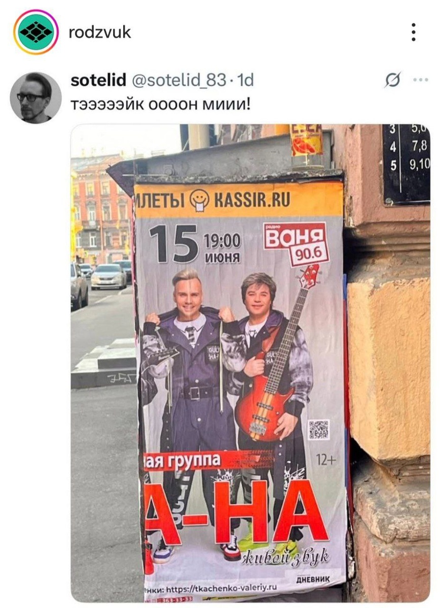 Смех-смехом, а на такой вот теме можно было бы вообще наружную рекламную кампанию радиостанции построить, или даже интернет-промо. Даром, что нынешнее Радио Ваня СПБ 90.6 - это когда-то очень приличное Радио Хит 90.6, где звучала в основном приличная иностранная музыка, в тч A-HA. Частота легендарная. Хотя вот так вот навскидку и не вспомнишь артистов, которые могли бы в подобном ключе быть задействованы НА-НА под видом A-HA Певица АНАСТАСИЯ под видом певицы ANASTACIA или герои мемов Михаил Шуфутинский и Rick Ross Игорь Корнлюк и Redfoo (LMFAO) У станции Ретро FM была прикольная рекламная кампания в конце 2000х - "Всегда в моде" - под неё, если не ошибаюсь, мы даже что-то запрашивали в Германии, то ли Modern Talking, то ли CCCatch, уже и не упомню, эти архивы, видимо, на какие-то старых Data CD... совсем недавно обнаружил, что эту рекламную кампанию выдумали не москвачи, а иностранцы - как и всё, наши её слямзили в Европе, вероятно даже во Франции у своих Lagardere или конкурентов - N