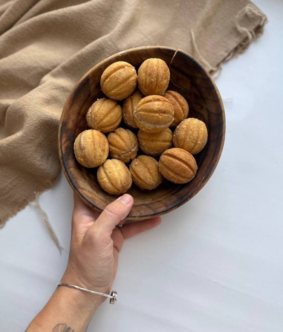 На каждую половинку орешка 9-10 г теста, в каждом орешке 10 г крема