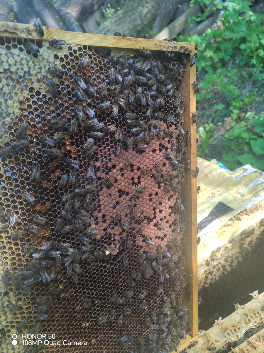 И так середина мая, конец весны, лето не за горами,но холодная погода затянулась. Третья неделя стоит холод, конечно были дни когда воздух прогревался до 15°С. Ночью были заморозки до -3°С, померз виноград, у некоторых и картофель. Пчелы летают вяло, даже выбрасывали трутневый расплод. Что касается молодых маток которые выходили к маю - еще не сеят! Хотя видел как выходили на облет при потеплении, так что ждем яйцекладки. Исключение одна семейка, которой я в апреле ставил контрольную рамку для вывода матки - там матка сеет уже с начала мая, есть печатный расплод. Матка облеталась. Что касается весеннего меда, мед есть, но его очевидно будет меньше раза в два- три, чем в прошлом году. В основном это мед который пчелы принесли в апреле. Самое главное что этот мед они могут использовать для пропитания сейчас в холод, поэтому качать спешить не буду. В приоритете мед летний. По поводу роения, некоторые семьи роились - тут уже нечего не сделаешь очень сильные семьи, но это нечего страшн