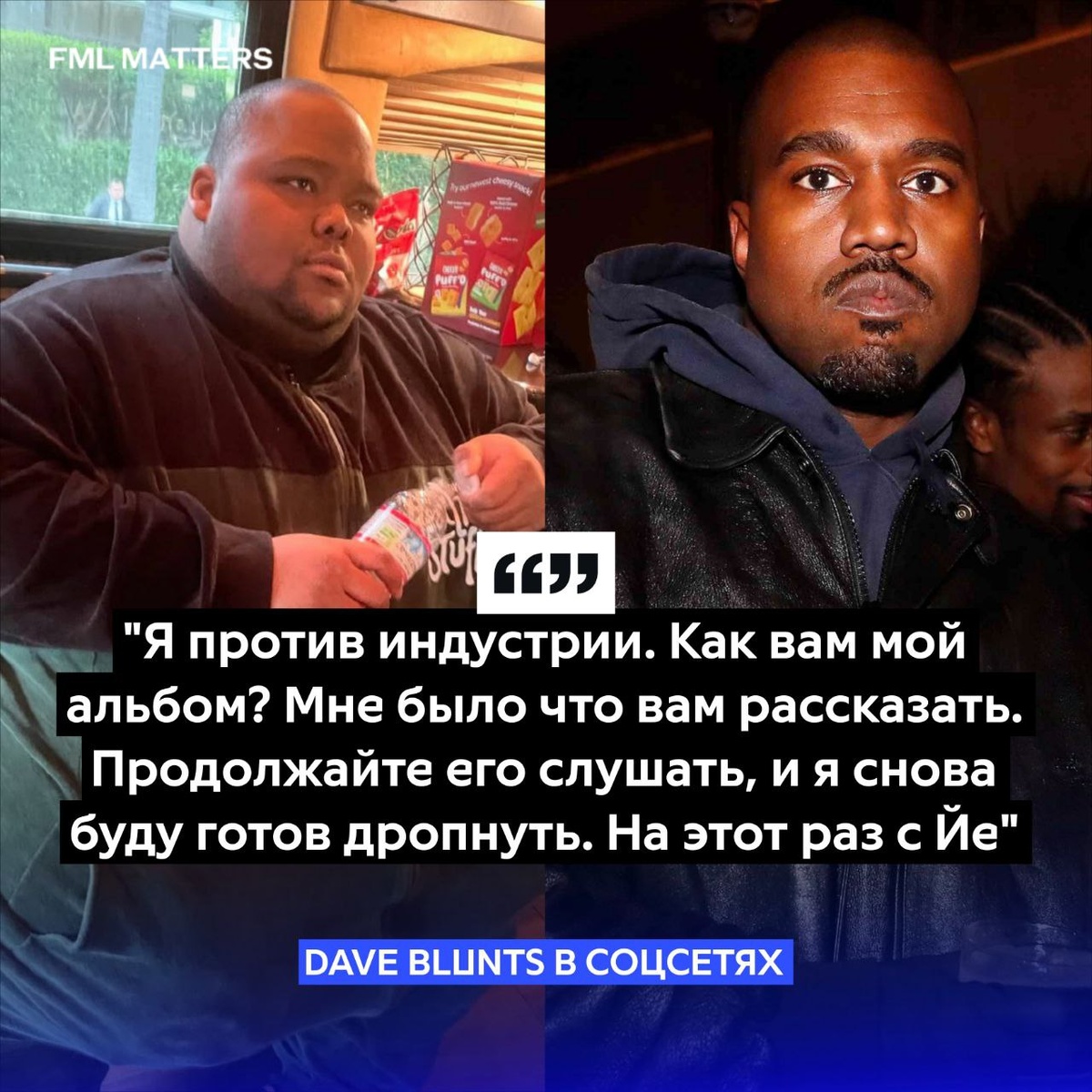 В ответ на пост ⁉️ DAVE BLUNTS СКОРО ДРОПНЕТ АЛЬБОМ С KANYE WEST? Дейв в соцсетях намекнул на скорый выход нового материала с Йе. Напоминаем, что в его последнем альбоме «YOU CAN'T SAY THAT», обещанных фитов с Йе не состоялось. 💀 FML MATTERS