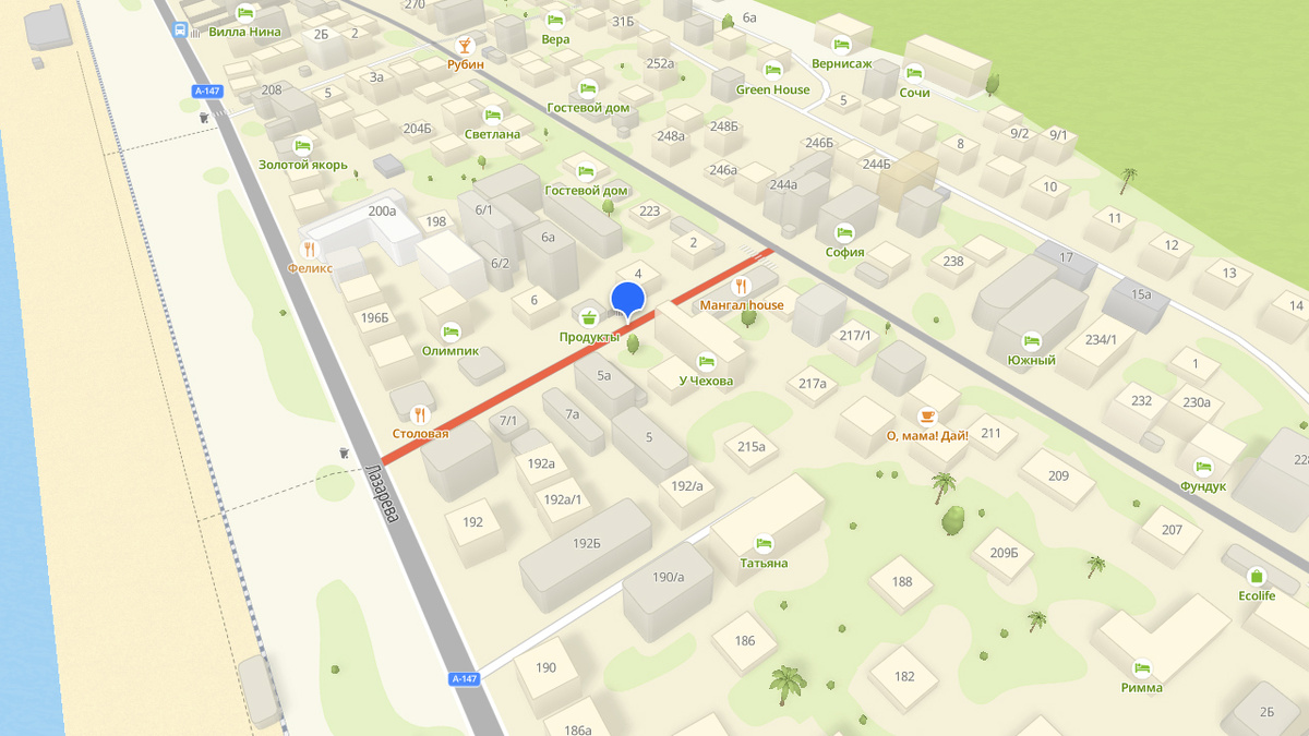 Улица Добролюбова в Лазаревском – это небольшая, но уютная улочка, расположенная ближе к Туапсе. Она находится на равнине, между улицами Победы (д. 244) и Лазарева (д. 196). Её длина составляет всего 140 метров, что делает её одной из самых коротких улиц в районе. Улица Добролюбова перпендикулярна улицам Лазарева и Победы, что обеспечивает удобный выход к основным транспортным артериям. При этом она удалена от центра Лазаревского, что делает её спокойным местом для проживания. Ближайшие ориентиры: Несмотря на небольшую протяжённость, здесь есть всё необходимое для жизни: Плюсы: