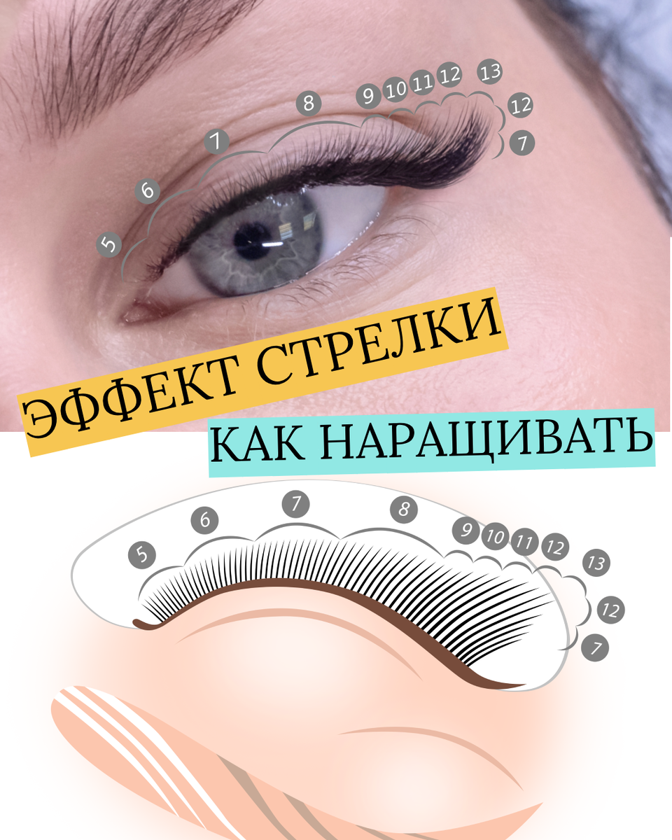 Без этого никуда. Середину делаем самыми короткими ресничками, а на внешний угол уходим на максимальные. Чем больше разница между серединой и кончиком стрелки — тем заметнее эффект. Пример — на нашей схеме (Самые последние ресницы не забудьте всё равно сократить, а то они провиснут)