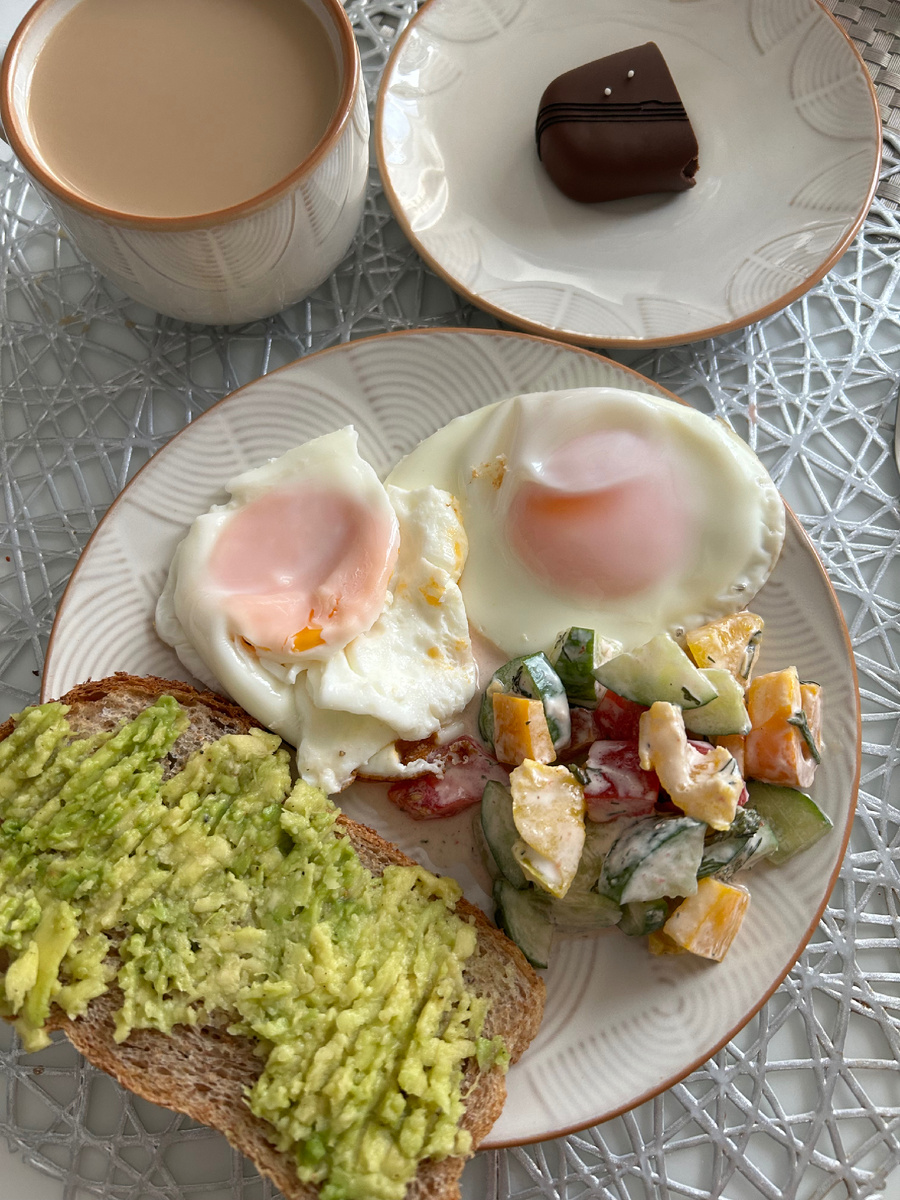 Приветствую, друзья и гости моего канала. Рабочая неделя подходит к концу, завтра уже пятница. Как время летит… Раньше, когда в школе училась или когда дети были маленькие, такого не было, казалось, что тянется время, а сейчас мчит. Я сначала думала, что это возраст, но дети мои тоже это ощущают так же, быстро проносятся недели. Может изменилось что-то в глобальном плане? Вы как думаете? Летит у вас время или тянется? Мы все мерзнем, через пару недель лето, а холодно на улице, да и дома тоже, квартира остыла после отключения отопления, еще и воды горячей нет, тоже профилактика, на неделю отключили. А хочется уже тепла и солнышка. У кого в регионе тепло? Зимой мы снежки друг другу отправляли, а теперь теплом поделитесь, плиз 😂 Разболталась что-то, давайте тарелочки свои покажу за сегодня. Завтрак Яичница из 2-х яиц, салат овощной, бутерброд с авокадо, кофе с молоком и 30 гр ПП пироженки. Перекус Два блинчика с курицей и кофе. Это меня коллега угостила, за день до этого я обмолвилась