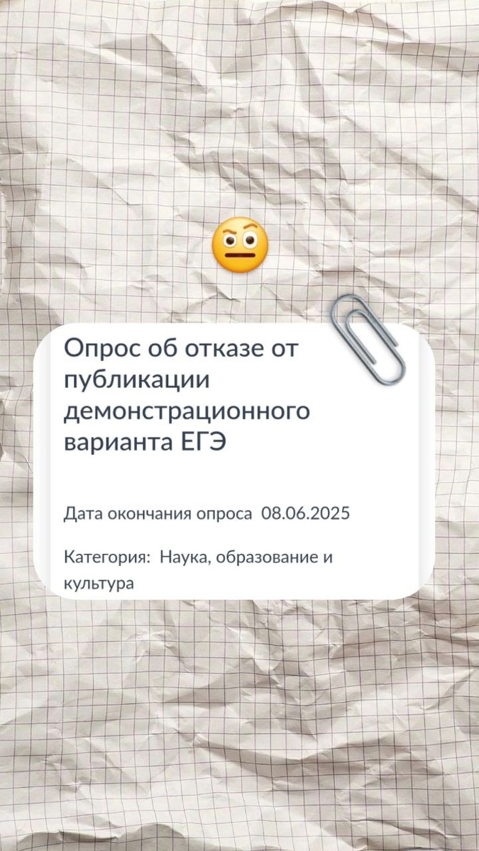 ЕГЭ всегда был в центре скандалов, недовольства и бурных обсуждений. Каждый год начинается с новостей об отмене экзамена, поисков новых форматов, но дальше дискуссий дело не идёт (что очень хорошо). Мало того, что отмена не состоится, ЕГЭ пророчат развитие. И первым шажочком к этому, по мнению Рособрнадзора, может быть эффект внезапности, а именно отсутствие у обучающихся и преподавателей демоверсии экзамена. Как вам? Решаю пройти опрос. Открываю. Среди "преимуществ" вижу следующее: Стоит отдать должное опроснику, участники могут выбрать определённые риски, связанные с возможным "развитием": Кроме перечисленных рисков, хочу отметить также психологический аспект. Обучающиеся и так во время подготовки с имеющимися вариантами и тематическими заданиями находятся с постоянном стрессе, представьте себе, что будет, если главную составляющую у них отнимут? Скандал. Паника. Ну и самое, наверное, интересное, статистика опроса: Радует, что здравомыслящих людей гораздо больше😊 Однако остаются в