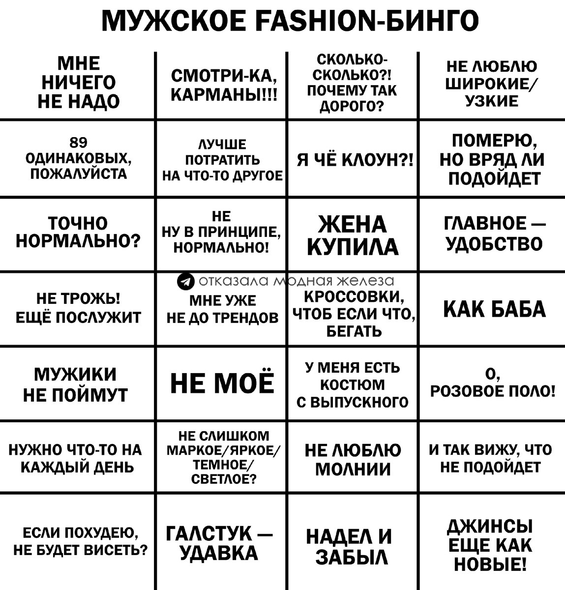 1. Начнем с игры. Мужиковое фешен-бинго.