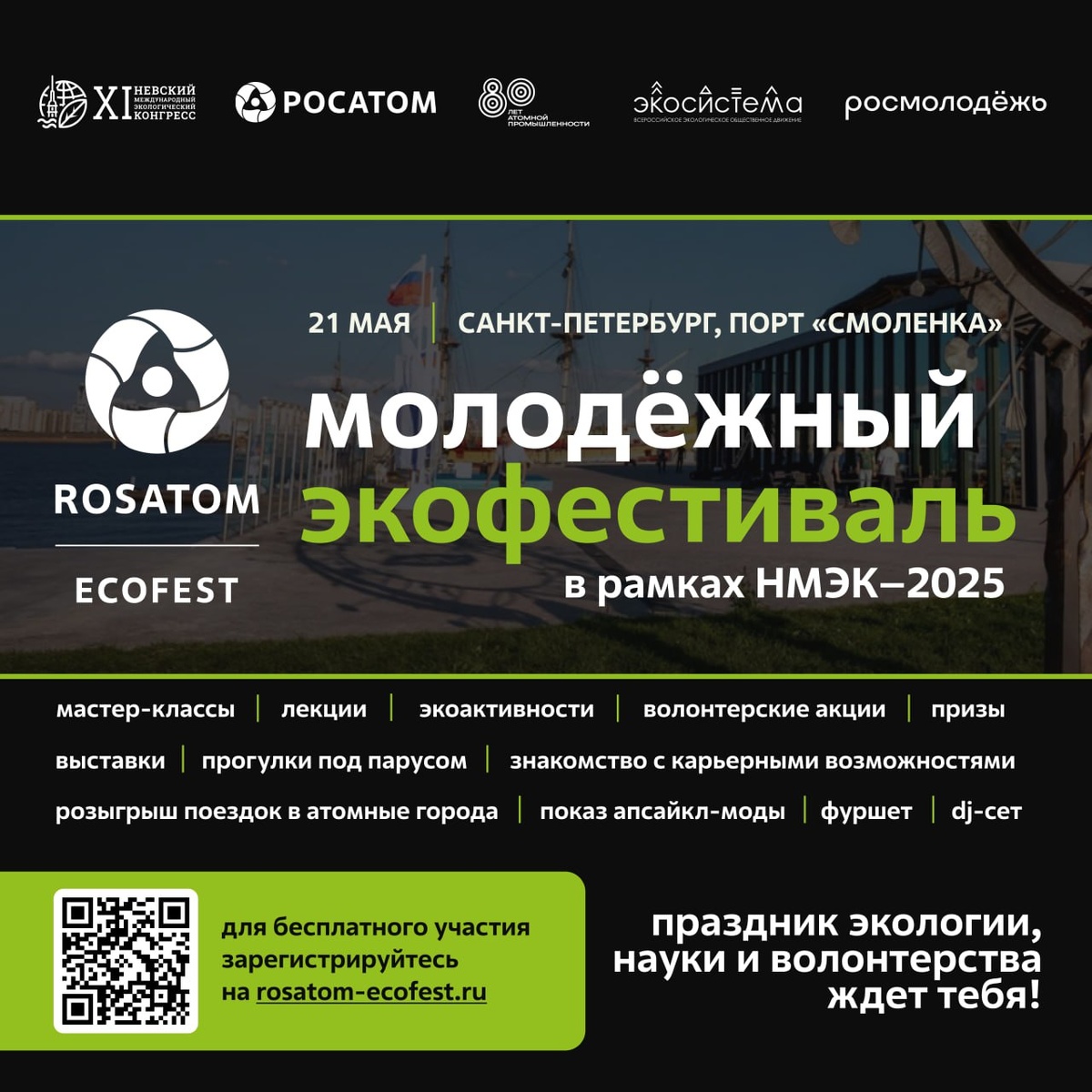 🌿 Эко, энергия, движ – на Молодёжном экофестивале «Росатом Экофест» Студенты, молодые специалисты и экоактивисты ЛЭТИ приглашаются на фестиваль, который пройдёт 21 мая в рамках XI Невского международного экологического конгресса при поддержке Госкорпорации «Росатом» и в сотрудничестве с Всероссийским экологическим движением «Экосистема» и Росмолодёжью. Что вас ждет? 🍃Выступления экспертов в области экотехнологий 🍃Волонтерские и экоактивности 🍃Викторины, квизы, розыгрыши призов 🍃Презентационные зоны компаний с возможностями для карьерного роста 🍃Выставка «Чистая энергия» и лучшие фотографии выставки «Первозданная Россия» 🍃Показ апсайкл-моды, прогулки под парусом и многое другое! Участие бесплатно по предварительной регистрации — подробности на сайте 🔍 #Росмолодежь #РосатомЭкофест